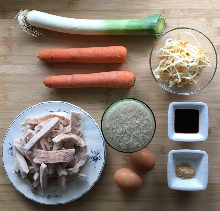 In einem Wok wird etwas Öl erhitzt und die Hähnchenstreifen darin angebraten. Sind diese aufgetaut, werden zuerst der Lauch und kurz danach die Karottenstreifen dazugegeben und unter Rühren kräftig mitgebrachten. Anschließend gebt ihr noch die Keimlinge dazu und lasst alles heiß werden, bevor ihr die Eier darüber verteilt und sie stocken lasst. Nun kommt der Reis dazu, der mit etwas kräftiger Brühe (etwa 30ml) gewürzt wird. Ihr solltet alles gut unterheben und miteinander vermischen. Dabei wird der Bratreis mit Knoblauch-, Zwiebel- und Ingwerpulver gewürzt. Schmeckt ihn außerdem mit Salz, Pfeffer und einigen Spritzern Sojasauce ab.
