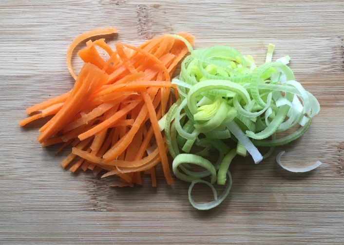 Kocht den Reis nach Packungsanweisung in einem Topf mit Salzwasser. Währenddessen werden die Karotten gewaschen, geschält und in feine Streifen geschnitten. Am schnellsten geht das mit einem Julienne-Schäler. Auch der Lauch wird geputzt, halbiert, gewaschen und in Streifen geschnitten. Die Mungobohnenkeimlinge lasst ihr ordentlich abtropfen. Die beiden Eier werden mit einem Schuss Sojasauce verquirlt. Sobald der Reis weich ist, wird er abgegossen und beiseitegestellt.