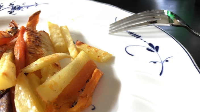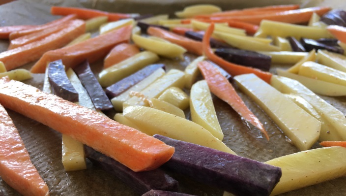 Währenddessen werden die Karotten und die bunten Kartoffeln ebenfalls geschält und in Stifte geschnitten. Wenn die Süßkartoffeln Wasser gezogen haben, werden sie abgegossen, mit der Stärke bestäubt und durchgemischt. Fügt das restliche Gemüse hinzu. Verrührt jeweils einen halben TL Salz, Pfeffer und edelsüß Paprika mit dem Öl. Gebt das Gewürzöl zu den Gemüsesticks und mischt alles gut durch, damit sich die Gewürze gleichmäßig verteilen. Breitet das Gemüse auf einem mit Backpapier belegten Blech aus.