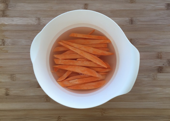 Schält die Süßkartoffel und schneidet sie in ca. 1 cm breite Stifte. Gebt diese für ca. eine Stunde in eine Schüssel mit Wasser.