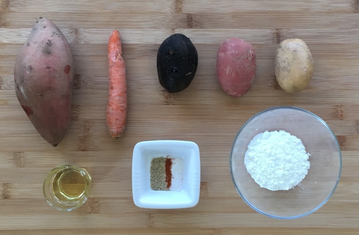1 Süßkartoffel 2 Karotten 400g blaue, rote und normale Kartoffeln 3EL Stärke 2EL Öl Salz, Pfeffer, Paprika